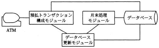 問05 5問選択銀行口座の管理に関する次の記述を読んで,設問に答えよ。 ある銀行の個人顧客口座の口座管理手数料,現金自動預払機(以下,ATM という)での 預払い及び ATM 使用手数料に関する口座情報を更新するプログラムである。 口座は,口座番号で識別される。口座には,所定の口座管理手数料が毎月掛かり, その月の月末処理で残高から引き落とされる。この口座管理手数料は, その口座の前月末日時点の残高が 10 万円以上であれば,当月分は掛からない。 口座に対しての ATM からの預入れ及び引出しの操作には,1回当たり所定の ATM 使用手数料が掛かり, 操作時に,その口座の残高から自動的に引き落とされる。この ATM 使用手数料も, その口座の前月末日時点の残高が 10 万円以上であれば,当月分は掛からない。 なお,同一口座に対しては,預入れ及び引出しの操作が完了するまで,ほかの操作は行えないものとする。 データベースには,所定の口座管理手数料及び所定の ATM 使用手数料と, 口座ごとの残高及び手数料マークが格納されている。 手数料マークは,前月末日時点の残高が 10 万円未満であった場合に “真”,そうでない場合に“偽”となる。 プログラムを構成する各モジュール間の関連を図に示す。