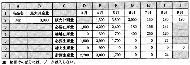 ![]() 図1 月別販売計画を記録したワークシート“販売計画”の例 (3) 図1のワークシート“販売計画”を基に,商品 M2 について3〜8月の半年分の 月別生産計画を作成したワークシート“生産計画”の例を図2に示す。