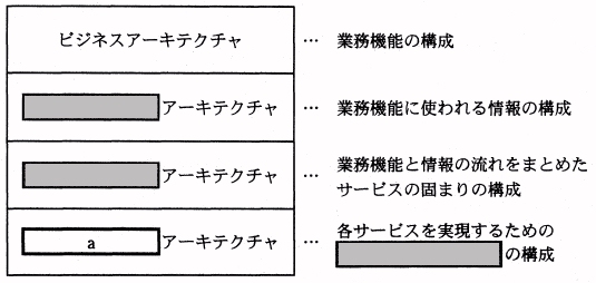 エンタープライズアーキテクチャに関する図中の a に当てはまるものはどれか。 ここで,網掛けの部分は表示していない。