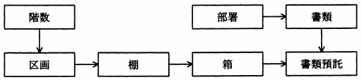 図1 倉庫,保管棚及び箱の構成 〔書類管理データベースの概要〕 (1) 階数表は,倉庫の階番号と階名称を管理する。 (2) 区画表は,倉庫の各階における区画名称を管理する。 (3) 棚表は,保管棚の配置された日付,位置(階番号と区画番号)及び棚名称を管理する。 (4) 箱表は,箱名称を管理する。 (5) 書類預託表は,部署から預かった書類の保管状況(預託日と返却日)を管理する。 預託日には,書類を預かった日付が設定される。返却日には, 書類を預かったときに NULL が設定され,書類を返却したときにその日付が設定される。 (6) 書類表は,書類の預け元の部署番号と書類名称を管理する。 (7) 部署表は,部署名称を管理する。 (8) A社の書類管理データベースの E-R 図を図2に,構造の一部を図3に示す。