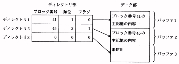 A データ部はバッファ1〜3の三つのバッファから成り,各バッファは1ブロック分の 主記憶の内容を保持できる。 B ディレクトリ部は,データ部のバッファ1〜3に対応したディレクトリ1〜3から成る。 それぞれのディレクトリは次の内容を保持する三つのフィールドから成る。 なお,データ部のバッファが未使用の場合は,対応するディレクトリの三つの フィールドすべてに0が入っている。 (イ) ブロック番号:対応するデータ部のバッファが保持する主記憶のブロック 番号 (ロ) 順位 :キャッシュ内に最も古くから存在するブロックから順に 1, 2, 3 と 番号が振られる。 (ハ) フラグ:対応するデータ部のバッファにブロックを読み込んだとき,0に初期化される。 対応するデータ部のバッファに保持されている内容が CPU の処理によって変更されると,1に変わる。