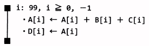 (1) 配列A,B,C及びDは 100 個の要素から成り,1要素は1語である。 添字は0から始まるものとする。 (2) データ領域の主記憶への割付けは,次のとおりとする。 A[0]は 4000 番地,A[1] は 4001 番地という順に割り付けられる。 A Bの配列領域:4100 〜 4199 番地(ブロック番号 42) B Cの配列領域:4200 〜 4299 番地(ブロック番号 43) C Dの配列領域:4300 〜 4399 番地(ブロック番号 44) D 定数 -1 と 99 の格納領域: 4400,4401 番地(ブロック番号 45) (4) プログラム領域の内容は表1のとおりとする。参照ブロックの数値は,その命令を 実行するときに CPU が参照するデータのブロック番号を示す。