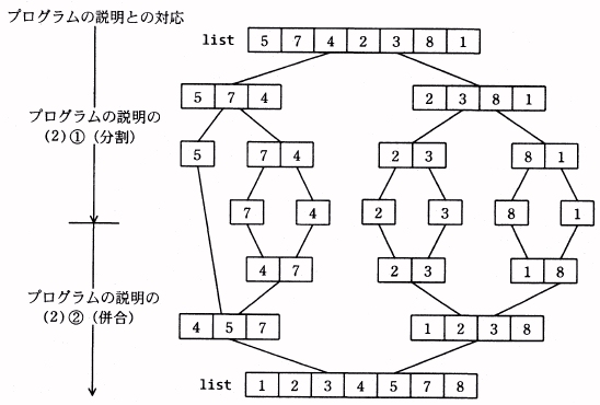 次のデータを例にして,整列処理の流れを図に示す。 配列 list のデータ:5,7,4,2,3,8,1