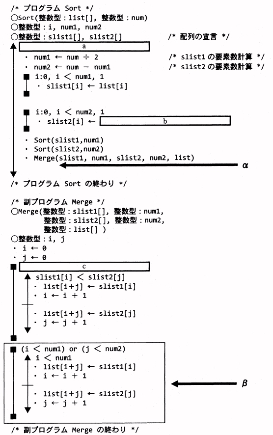 問08 必須問題次のプログラムの説明及びプログラムを読んで,設問1〜3に答えよ。 〔プログラムの説明〕 プログラム Sort は配列に格納された整数値のデータを再帰的に分割し, 分割したデータの値の大小を比較しながら併合していくことでデータを昇順に整列するプログラムである。 Sort は併合に副プログラム Merge を使用する。 (1) num 個( num ≧1)のデータを配列 list に格納して Sort を呼び出すと, 整列された結果が配列 list に返却される。 (2) Sort では,次の手順で配列 list に格納された整数値のデータを整列する。 A Merge を使用し,二つの配列 slist1 と slist2 を併合して一つの配列 list にする。 (3) Merge では,次の手順で,整列済の二つの配列 slist1 と slist2 を併合し, 整列した一つの配列 list を作成する。 A 配列 slist1 と slist2 の要素を順に比較して,小さい方から順に配列 list に格納する。 B 配列 slist1 又は slist2 の残った要素を配列 list に追加する。 (4) Sort と Merge の引数の仕様を表1,2に示す。配列の添字は0から始まる。