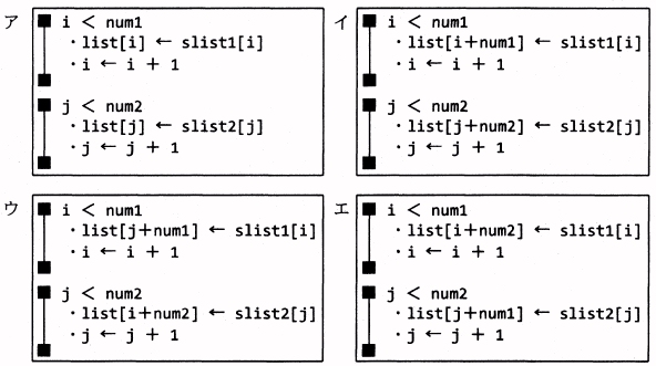 設問1 プログラム中の a に関する解答群 ウ num > 1 エ num > 2 ウ list[num1+i] エ list[num2+i] c に関する解答群 ウ ( j < num1 ) and ( i < num2 ) エ ( j < num1 ) or ( i < num2 ) オ ( i + j ) < ( num1 + num2 ) カ ( i + j ) ≦ ( num1 + num2 ) キ ( i + j ) > ( num1 + num2 ) ク ( i + j ) ≧ ( num1 + num2 )