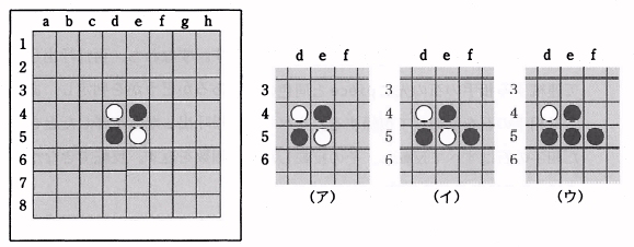 図1 盤の初期状態 図2 盤に石を置く例 プレーヤは,空いている升に石を置いて,縦,横,斜めのどれかの方向に隣接する相手の石を 自分の色の石で挟まなければならない。このとき,挟んだ相手の石をすべて反転させ自分の色の石とする。 図2に,黒をもつプレーヤが盤に石を置く例を示す。 (ア) は図1の中央部分を抜き出したものであると (イ) は,黒を升 f5 に置いて, 升 e5 の白を挟んだ状態である。(ウ) は,挟んだ白を反転させて黒にした状態である。 相手の石を挟むことができないときは,そのプレーヤは石を置くことができないので, 手番をパスする。片方の色の石が盤上からなくなったとき,すべての升が石で埋まったとき, 又は空いているどの升にも石が置けなくなったとき,ゲームは終了し, 自分の色の石の個数の多い方のプレーヤが勝ちとなる。 列挙 Piece は石の面を表す。フィールド BLACK は黒,WHITE は白を表す。 クラス Player は,プレーヤを表す。フィールド piece は,そのプレーヤの石の色を表し, フィールド count は,盤上での石の個数を表す。 クラス Board は盤を表し,対戦を支援する次の (1) 〜 (7) の機能を実現する。 (1) 配列 grid は,盤の升を表す。配列要素 grid[row][col] において,row は行, col は列である。例えば,升 d2 は,grid[1][3] で表される。 (2) 列挙 Direction は,配列 grid において,縦,横, 斜め8方向の隣接する升への row 及び col のオフセットを表す定数である。 (3) コンストラクタは,インスタンスを生成し,盤を初期状態にする。 (4) メソッド canPlace は,引数 player で与えられたプレーヤが石を置ける升が あるかどうかを調べ,あるときは true,ないときは false を返す。 (5) メソッド reverse は,引数 row, col で与えられた升に引数 piece で与えられた色の石を置いた場合, その升から引数 dir で与えられた方向に隣接する升の石が反転可能であれば反転する。 このメソッドは,反転可能かどうかを判断するために隣接する升に対して自身を再帰的に呼び出す。 すなわち,再帰呼出しによって連続する相手の石の先に piece と同色の石があるかどうかを判定し, あった場合は相手の石を反転して復帰する。すべての再帰呼出しから復帰したとき, 挟んだ相手の石はすべて反転し,その反転した石の個数を返す。 反転できなかったときは,0又は負の値を返す。 (6) メソッド place は,引数 position で指定された升に引数 player で与えられたプレーヤの 石が置けるかどうかを判定する。石が置ける場合は,升に石を置き,挟んだ相手の石を反転し, 反転した石の個数を返す。この処理は,メソッド reverse を呼び出して行う。 指定された升に既に石がある場合,又は相手の石を1個も反転できない場合は, 0又は負の値を返し,指定された升に石は置かない。 (7) メソッド display は,盤の状態を表示する。 クラス Reversi はゲームを実行する。変数 player は,石を置く番のプレーヤである。 変数 opponent は,player の対戦相手である。黒をもつプレーヤが常に先手である。 player が石を置いた後に,それぞれのプレーヤの色の石の個数を更新し, ゲームの終了を判断する。ゲームが終了した場合は,盤の最後の状態を表示してプログラムを終了する。 終了しなかったときは,player と opponent が交代し,ゲームを続行する。 メソッド prompt は,引数 player の石の色を表示し,石を置く升を“列行”の形式で 入力するように促し,入力された升の位置を文字列で返す。 〔プログラム1〕