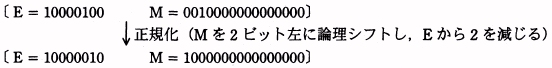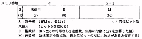 〔プログラム〕 1 FADD START ; Z ← X + Y 2 RPUSH 3 PUSH 0,GR3 ; 結果 Z の格納領域の先頭番地を退避 4 LD GR4,0,GR1 5 AND GR4,=#00FF ; Ex: X の指数 6 LD GR5,0,GR2 7 AND GR5,=#00FF ; Ey: Y の指数 8 LD GR6,1,GR1 ; Mx: X の仮数 9 LD GR7,1,GR2 ; My: Y の仮数 10 ; 加算前の準備 (指数をそろえる) 11 ; GR4 ← max(Ex,Ey) , GR6 ← 調整済 Mx , GR7 ← 調整済 My 12 LD GR3,GR4 13 CPL GR4,GR5 14 JZE MADD ; Ex = Ey の場合 15 JMI BIGEY ; Ex < Ey の場合 16 SUBL GR3,GR5 17 SRL GR7,0,GR3 ; My を調整 18 JUMP MADD 19 BIGEY
