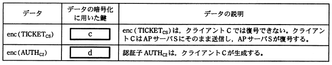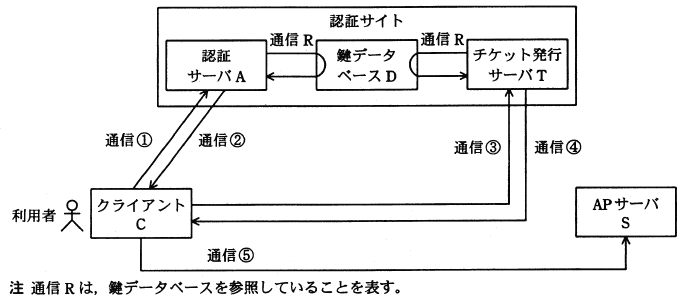 ![]() 図1 新認証システムの構成 〔新認証システムの構成と方式についての説明〕 (1) 新認証システムでは,共通鍵暗号方式によって,通信データを暗号化する。 以下,共通鍵を鍵という。 (2) 認証サイトは,認証サーバ,鍵データベース及びチケット発行サーバで構成する。 (3) チケット発行サーバの鍵は,チケット発行サーバ自体と鍵データベースに登録されている。 (4) 各 AP サーバの鍵は,それぞれの AP サーバ自体と鍵データベースに登録されている。 (5) 利用者の鍵は,利用者のパスワードから計算して決められ,鍵データベースに登録されている。 クライアントには,利用者が入力したパスワードから計算した鍵が, 利用者がクライアントの利用を終了するまで,一時的に保持される。 〔認証のための通信の例〕 図2は,利用者が,クライアント C から目的の AP サーバ S にアクセスする場合の認証の流れを示す。
