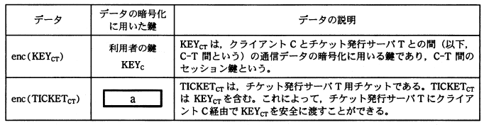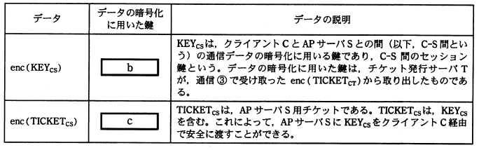 設問 本文中の a に関する解答群 ウ チケット発行サーバ T の鍵 KEYT エ 利用者 ID IDC ウ C-S 間のセッション鍵 KEYCS エ C-T 間のセッション鍵 KEYCT オ チケット発行サーバ T の鍵 KEYT ウ C-T 間のセッション鍵 KEYCT エ チケット発行サーバ T の鍵 KEYT