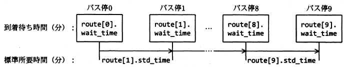 図1 路線表 route のデータ @ route[i].std_time( i=1,2,…,9 )は,前のバス停( i−1 )からこのバス停 i までの 標準所要時間である。バス停 0 における route[0].std_time の値は 0 とする。 A 各バス停 i の到着待ち時間 route[i].wait_time( i=1,2,…,9 )は, 次に到着するバスが最後に発車したバス停 a からこのバス停 i までの 標準所要時間 route[k].std_time( k=a+1,…,i )の合計である。 乗客の乗降にかかる時間は 0 とする。 バス停 0 における route[0].wait_time の値は 0 とする。 次に到着するバスがバス停 0 を発車していないとき, そのバス停 i における到着待ち時間 route[i].wait_time には 0 を格納する。 (5) バスの走行位置 bus[j].cur_pos( j=0,1,…,4 )には,走行中の区間番号を格納する。 あるバス停から次のバス停までの区間に対する区間番号には, 区間の始まりとなるバス停番号を割り当てる。 バス停 0 を発車していないバスの走行位置 bus[j].cur_pos には −1 を格納する。 また,バス停 9 に到着したバスの走行位置 bus[j].cur_pos には 9 を格納する。 (6) プログラム中で使われる変数 preceding と succeeding の意味は次のとおりである。