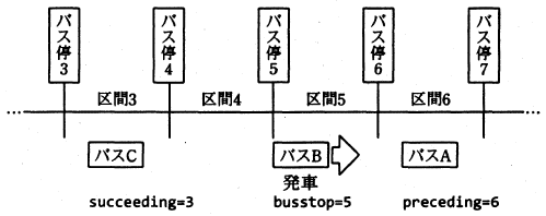 バス停 5 をバス B が発車するとき,バス停 5 を直前に発車したバス A が区間 6 を走行し, 次にバス停 5 に到着するバス C が区間 3 を走行しているときの例を,図2に示す。