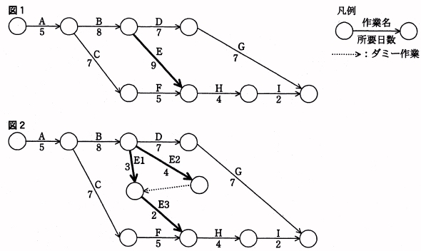 問51 ファストトラッキング技法ファストトラッキング技法を用いてスケジュールの短縮を行うと当初の計画は図1のとおりである。 作業 E を作業 E1,E2,E3 に分けて,図2のように計画を変更すると,スケジュールは全体で何日短縮できるか。 ![]() 解説