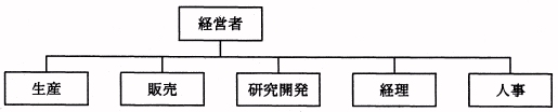 図のように業務の種別を「生産」,「販売」,「研究開発」などの職能ごとに分ける組織形態は、 「職能別組織」である。