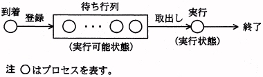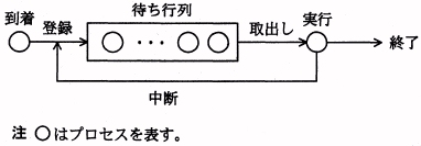 図1 到着順方式 到着順にプロセスを待ち行列の末尾に登録する。実行中のプロセスが終了すると, 待ち行列の先頭からプロセスを一つ取り出して実行を開始する。 また,実行中のプロセスが一定時間(以下,タイムクウォンタムという)を経過したら,実行を中断して, 待ち行列の末尾に再登録し,待ち行列の先頭からプロセスを一つ取り出して実行を開始する。 ラウンドロビン方式を図2に示す。