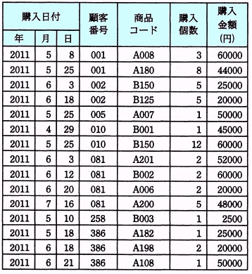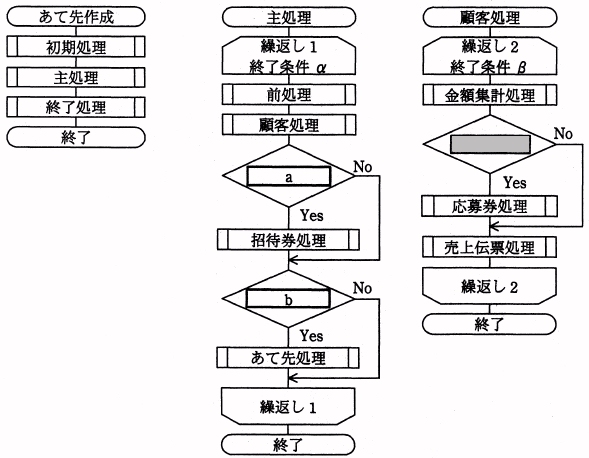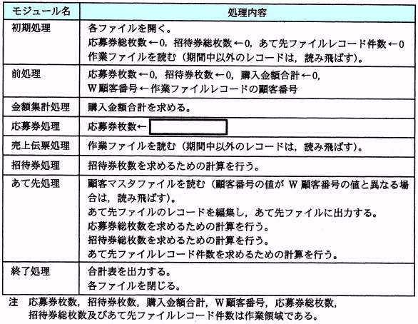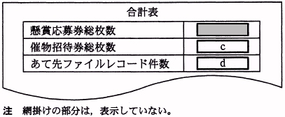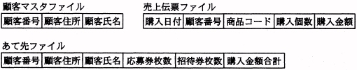 問05 5問選択あて先作成プログラムに関する次の記述を読んで,設問1〜3に答えよ。 通信販売会社のZ社では,顧客に対して顧客番号を発行し,顧客マスタファイルで管理している。 このたび,2011 年5月 10 日から6月 20 日までの販売促進キャンペーン期間中 (以下,期間中という)の顧客の購入状況に応じて,懸賞応募券(以下,応募券という)と 催物招待券(以下,招待券という)を郵送することになった。 そこで,売上伝票ファイルから応募券と招待券を送る顧客を選び,あて先ファイルを出力する あて先作成プログラムを作成することにした。 このプログラムに必要な機能は,次のとおりである。 (1) 顧客ごとの応募券の枚数は,この販売促進キャンペーンの対象商品である 商品コード A001 〜 A199 の商品を期間中に購入した個数と同数とする。 (2) 顧客ごとの招待券の枚数は,期間中に購入したすべての商品の購入金額の 合計が5万円以上の顧客に対して1枚とする。 (3) 応募券又は招待券を送る顧客ごとに,あて先ファイルに1件のレコードを作成する。 応募券と招待券の両方を送る場合でも1顧客に対して1件のレコードを作成する。 (4) 応募券の総枚数,招待券の総枚数及びあて先ファイルのレコードの件数を,合計表に印字する。 顧客マスタファイル,売上伝票ファイル,あて先ファイルは順ファイルである。 これらのレコード様式を,図1に示す。