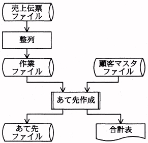 図1 各ファイルのレコード様式 このプログラムの入出力関連を図2に,プログラムの流れを図3に,主なモジュールの 処理内容を表1に示す。また,このプログラムのテストに用いる作業ファイルのテストデータを 表2に,このテストデータを用いた場合の合計表の出力結果を図4に示す。