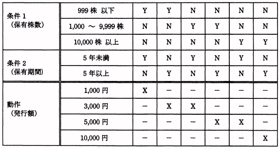 図1 株主ファイルのレコード様式 @ 株主番号には,株主に対して一意に割り当てた番号が設定されている。 A 保有株数には,保有する株数が設定されている。保有株数の最大は 999,999 とする。 B 登録年には,最初に株主一覧に登録された年が設定されている。ただし,株をすべて 売却した後に再取得した株主の場合は,再取得後,株主一覧に登録された年が設定される。 (2) 保有期間は,登録年から 2011 年までの年数で決定する。例えば,登録年が 2006 年の場合は5年である。 (3) この会社が株式公開したのは 1990 年4月1日であり,最初に株主一覧へ登録されるのは 1991 年3月 31 日である。したがって,最長保有期間は 20 年である。 (4) 商品券ファイルは,図2に示すレコード様式の順ファイルである。