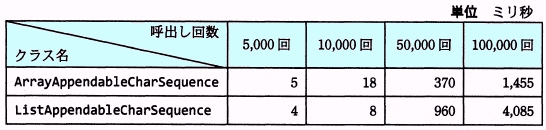 設問2 クラス Test を用いて各クラスのメソッド append の実行時間(ミリ秒)を 測定したところ,表1の結果になった。