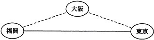 問19 ネットワークシステム東京〜福岡を結ぶ回線がある。この回線の信頼性を向上させるために, 図に示すような東京〜大阪〜福岡を結ぶ破線の迂回(うかい)回線を追加した。 迂回回線追加後における,東京〜福岡を結ぶネットワークの稼働率は幾らか。 ここで,回線の稼働率は,東京〜福岡,東京〜大阪,大阪〜福岡の全てが 0.9 とする。