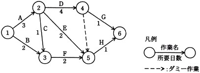 次のアローダイアグラムで表されるプロジェクトがある。結合点5の最早結合点時刻は第何日か。