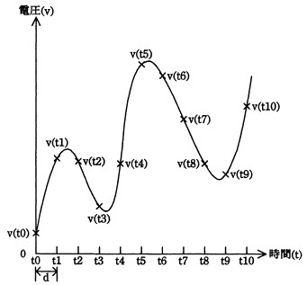 問01 5問選択A/D 変換に関する次の記述を読んで,設問1〜3に答えよ。 A/D 変換とは,アナログ信号をディジタル信号に変換することであり,標本化, 量子化,符号化の3段階で処理する。 直流の電圧を例に n ビットの A/D 変換を説明する。 (1) 標本化 標本化では,時間的に連続したアナログ信号である電圧を一定の時間間隔で測定する。 図1では,時間軸を t0,t1,… と等間隔 d で区切り,各時刻での電圧を v(t0),v(t1),… と表す。