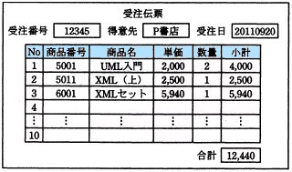問05 5問選択書籍の卸売業者の受注システムに関する次の記述を読んで,設問1,2に答えよ。 書籍の卸売業者の受注システム開発のために,オブジェクトを抽出し,その関係を示すオブジェクト図を作成し, それを基にクラス図を作成することにした。 〔受注業務の説明〕 (1) 得意先から注文を受けると,受注伝票に受注日,得意先と注文された商品の商品名などを記入する。 受注伝票の例を図1に示す。