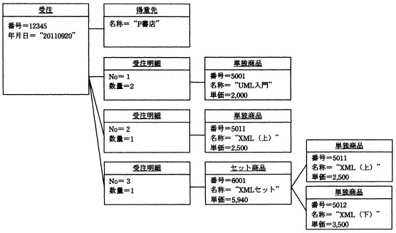 ![]() 図1 受注伝票の例 (2) 商品には,単独商品とセット商品がある。セット商品は,2種類以上の単独商品を組み合わせたものであり, セット商品としての商品名をもつ。セット商品の価格は,そのセットを構成する単独商品の価格の合計から 1% 割り引かれる。一度の注文では,10 種類を超える商品は注文できない。 受注業務のシステム化に当たり,システム化対象となる主なオブジェクトとその主な属性を抽出し, 複数のオブジェクト図を作成した。その一つを図2に示す。 図2は,P 書店から“UML 入門”を2冊,“XML(上)”を1冊,“XML(上)”と“XML(下)”の セット商品“XML セット”を1セット受注したときのオブジェクト図である。