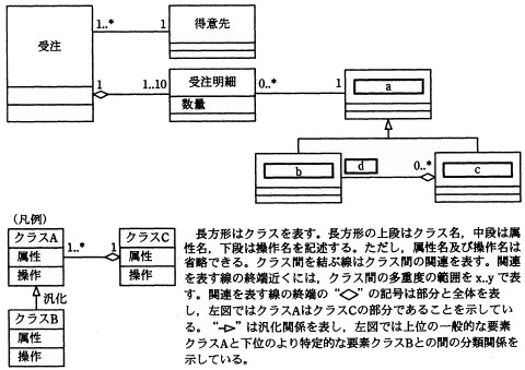 ![]() 図2 オブジェクト図 次に,クラス抽出と多重度を検討して,図3に示す分析のためのクラス図を作成した。多重度とは, 一方のクラスの一つのオブジェクトに対して接続されている,他方のクラスのオブジェクトの個数を示すものである。