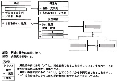 設問2 図3に基づいて,各クラスに必要な属性と操作を検討した。受注には年月日,合計などを保持し, 受注明細には No,数量などを保持することにした。また,受注の合計は,受注明細ごとの金額を求めてから 算出することにした。
