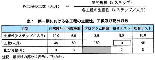 設問1 要員数の算出に関する次の記述中の 第一期における各工程の生産性,工数及び配分月数を表1のとおりに設定した。生産性とは,各工程での 1人月当たりの開発規模であり,配分月数とは,あらかじめ各工程に設定した開発期間(月数)である。 各工程の工数は次の式で算出する
