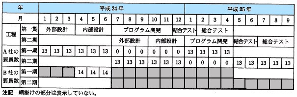 問06 5問選択プロジェクトの要員計画に関する次の記述を読んで,設問1〜3に答えよ。 製造会社のA社では,社内の情報システムを再構築することになった。新システムは,将来の保守性を考慮して, 既存システムの改修による機能強化ではなく,全て新規に開発する。開発が大規模になることから, 要員を確保しやすいよう,2期(第一期と第二期)に分けて開発することになった。 新システムの開発は,A社の要員と,システムの保守を委託している SI 企業B社の要員との共同体制で行うことにした。 既存システムの開発実績を基に,開発規模や要員の生産性などを推定して,プロジェクトの要員計画を作成する。 〔プロジェクトの説明〕 (1) 新システムの開発規模は,第一期及び第二期ともに 480k ステップである。 (2) 両期ともにウォータフォールモデルに基づいて,外部設計,内部設計,プログラム開発(単体テストを含む), 結合テスト及び総合テストの五つの工程に分ける。 (3) 各工程での要員計画の前提条件は,次のとおりである。 @ 各月のA社の要員数は,第一期及び第二期の全期間を通して 13 名に固定する。 A A社の要員には,全期間を通して全員に作業を常に割り当てる。 B プログラム開発工程には,第一期及び第二期ともにA社の要員を割り当てない。 C 各月の必要要員のうち,A社の要員だけでは不足する場合には,B社の要員を割り当てる。 (4) 第一期は平成 24 年1月から開始する。第二期は第一期のプログラム開発の開始月から並行して開始する 予定である。