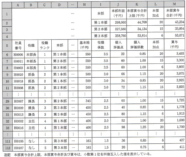K社では,役職及び個人評価に加えて,本部ごとの利益(以下,本部利益という)を賞与に反映するために, 本部利益に応じた評価点(以下,本部加点という)を加味するよう賞与の計算式を見直すことにした。 〔見直した賞与計算方式に関する説明〕 (1) 見直した賞与計算式は次のとおりである。 @ 役職が本部長,部長又は課長のとき 賞与=基本給×(役職係数+個人評価係数+本部加点/10) A 役職が主任又はなしのとき 賞与=基本給×(役職係数+個人評価係数+本部加点/20) (2) 本部に属する社員の賞与の合計(以下,本部賞与合計という)が,本部利益の 15% の金額 (以下,本部賞与合計上限という)以下となる条件を満足する 1 〜 20 の整数があるときは,その最大値を 本部加点とする。無いときは,本部加点を 0 とする。 条件を満足する本部加点を求め,それを加味した賞与計算を行うために,ワークシート“新賞与計算”と マクロ BonusCalc を作成した。そのワークシート及びマクロ BonusCalc の実行結果の表示例を図4に示す。