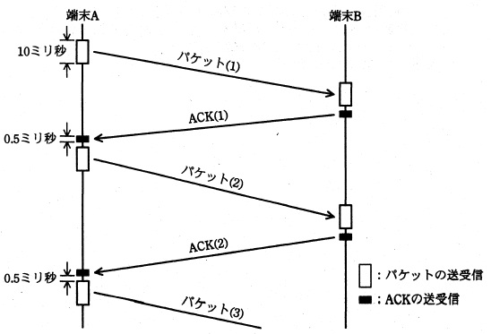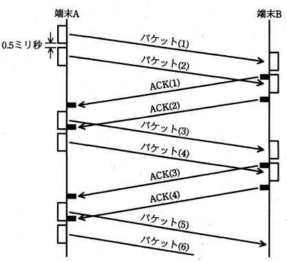 データの転送に掛かる時間を短縮するために,端末 B の受信バッファを 2.4k バイトに拡大した。 端末 A は,端末 B の受信バッファに空きがあることが確かなときは,送信したパケットに 対応する ACK の受信を待たずに次のパケットを送信することができる。すなわち, “送信済みのパケット数 − 受信済みの ACK 数”が1以下であれば,端末 A は次のパケットを 送信できる。パケット1個の送信を完了してから次のパケットが送信可能になるまでに 掛かる時間は 0.5 ミリ秒であり,その他に掛かる時間は受信バッファの 大きさが 1.2k バイトのときと同じである。 パケットの送信と ACK の受信,及びパケットの受信と ACK の送信は,並行して 行うことができる。このときの通信の様子を,図2に示す。