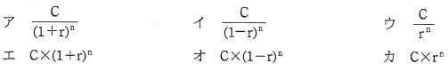 なお,投資年については,n=0 で計算する。 将来の各年におけるキャッシュの増減に対して,その現在価値を計算し, 次に各年の現在価値を合計することで NPV が求められる。NPV が正のときは, その投資案は採算性があり,NPV が大きいほど採算性が高いと評価される。 NPV が負のときは,その投資案は採算性がなく,投資するべきでないと評価される。 NPV が正の投資案が二つ以上あるときは,NPV の最も大きな投資案を選択するべきである。 解答群
