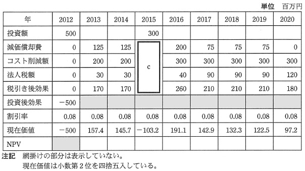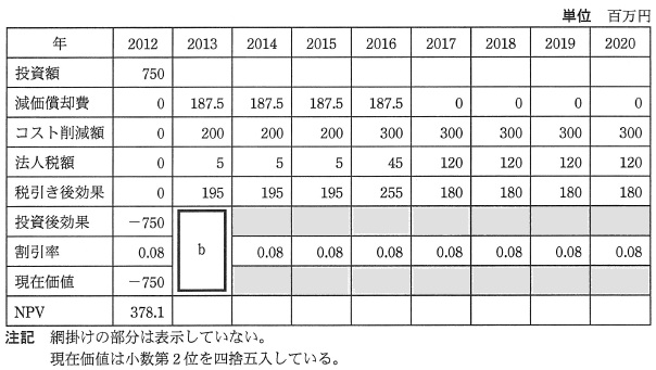設問3 生産管理システムの NPV の再計算に関する次の記述中の に