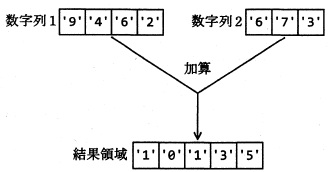 図1の数字列1と数字列2を引数として副プログラム ADDC を実行した場合,