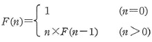 再起呼び出しによる階乗の計算である。たとえば、5! を求める場合、 4! に5を掛けて計算する。4! は、3! に4を掛ける。よって、乗算の回数は、nである。