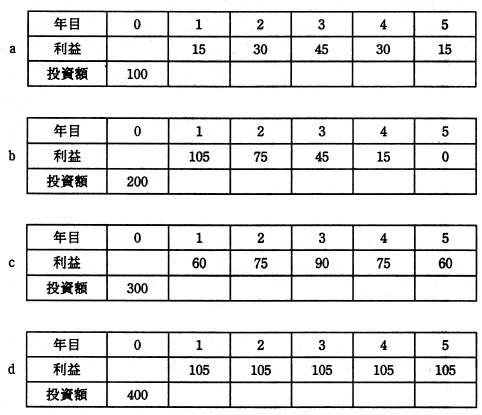 問64 投資効果の最も効果が高いものIT 投資案件において,5年間の投資効果を ROI(Return On Investment)で評価した場合, 四つの条件 a 〜 d のうち,最も効果が高いものはどれか。ここで,内部収益率(IRR)は 0 とする。