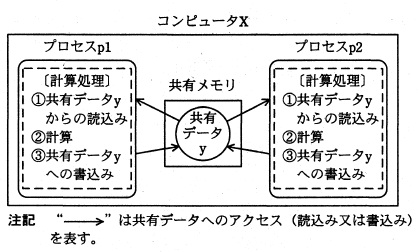 問01 5問選択プロセスの排他制御に関する次の記述を読んで,設問1〜3に答えよ。 複数のプロセスが,共有するデータ(以下,共有データという)を書き換える処理を, 並行して実行する場合がある。このようにプロセス間でデータを共有する方法の一つとして, プロセス間で共有するメモリ(以下,共有メモリという)に共有データを格納する方法がある。 ここでは,CPU が一つで共有メモリをもつコンピュータ X 上で,二つのプロセス p1,p2 が 共有メモリを使用して並行に処理を実行する場合を考える。 プロセス p1,p2 が共有データ y に対して計算処理をする場合を,図1に示す。 ここで,各プロセスの計算処理は,次のとおりである。 〔計算処理〕
