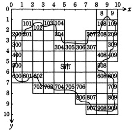 問13 表計算次の表計算,ワークシート及びマクロの説明を読んで,設問1〜3に答えよ。 〔表計算の説明〕 S市では,急激な人口増加に伴い小学校の新設を検討している。 そこで表計算ソフトを用いて候補地選定に関するシミュレーションを行うことにした。 (1) 図1のように,縦横が同じ長さの升目(以下,メッシュという)でS市を分割する。 また,候補地選定では,処理を簡略にするために,それぞれのメッシュ内に 住んでいる全ての小学生(以下,児童という)は,メッシュの中心点から 同じ小学校に通学するとみなす。 (2) S市をメッシュで分割したときの左上を原点,水平方向右向きを x 軸の正の向き, 垂直方向下向きを y 軸の正の向き,メッシュの1辺の長さを1とする2次元座標系を 定義する。このとき,S市を分割したメッシュの個数は 70 であった。 (3) 各メッシュを区別するために ID を設定する。左上の座標が (x,y) で あるメッシュの ID を x+100y とする。ここで, 全てのメッシュの左上の x 座標は0以上 100 未満の整数,y 座標は0以上の整数とする。