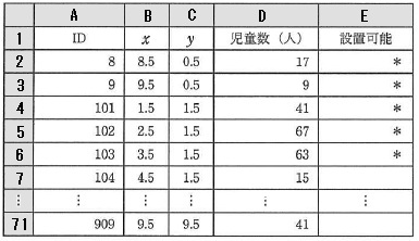 ![]() 図2 ワークシート“児童数分布表” (1) セル A2 〜 A71 には,メッシュの ID を入力する。 (2) B2 〜 B71 には,該当するメッシュの中心点の x 座標を求める式を, セル C2 〜 C71 には,該当するメッシュの中心点の y 座標を求める式を入力する。 (3) セル D2 〜 D71 には,該当するメッシュ内に住んでいる児童数を入力する。 (4) セル E2 〜 E71 には,小学校が設置可能なメッシュのとき“*”を入力する。