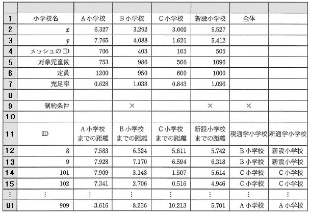 (4) セル F12 〜 F81 には,対応するメッシュ内に住んでいる児童が 現在通学している小学校(現通学小学校という)の名称を入力する。 3小学校のうち最も距離が短い小学校に通学しているとは限らない。 (5) セル G12 〜 G81 には,小学校を新設した場合,対応するメッシュ内に 住んでいる児童が通学すべき小学校の名称を求める式を入力する。 新設小学校までの距離が,現通学小学校までの距離よりも短いメッシュに 住んでいる児童は,新設小学校へ転校することになる。 (6) セル B4 〜 E4 には,各小学校が配置されているメッシュの ID を求める式を入力する (7) セル B5 〜 E5 には,小学校をセル E2,E3 で示す場所に新設する場合の 各小学校の対象児童数を求める式を入力する。 (8) セル B6 〜 E6 には,各小学校の定員を入力する。 (9) セル B7 〜 E7 には,各小学校の対象児童数を定員で割った値(充足率という) を求める式を入力する。 (10) セル B9 〜 D9 には,制約条件として,各小学校の対象児童数が定員を 超えていなければ空値に,定員を超えていれば“X”になる式を入力する。 (11) セル E9 には,制約条件として,次の条件を全て満たしていれば空値に, 一つでも条件を満たさない場合は“X”になる式を入力する。 条件2:小学校の対象児童数が定員を超えていない。 条件3:小学校を配置するメッシュ内に既設小学校が存在しない。 (12) セル F9 には,既設3小学校及び新設小学校の全てが制約条件を 満たしていれば空値に,そうでなければ“X”になる式を入力する。