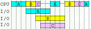 問18 マルチプログラミング三つのタスクの優先度と,各タスクを単独で実行した場合の CPU と入出力装置( I/O )の 動作順序と処理時間は,表のとおりである。 三つのタスクが同時に実行可能状態になってから,全てのタスクの実行が終了するまでの, CPU の遊休時間は何ミリ秒か。 ここで,I/O は競合せず,OS のオーバヘッドは考慮しないものとする。 また,表の()内の数字は処理時間を示す。