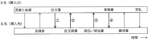 問80 売買契約の成立S 社が備品を購入するとき,購入先の K 社と図の手順で取引を行っている。 この取引手順の中で,売買契約が成立するのはどの時点か。 ここで,取引の内容は見積書以降の取引手順を通じて変わらないものとする。