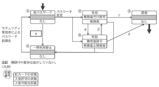 図1 社員を対象とした状態遷移図 設問1 〔 J 社の入退室管理システムのセキュリティ要件〕の説明中の 下線@の IC カードの説明として正しい答えを,解答群の中から選べ。 解答群
