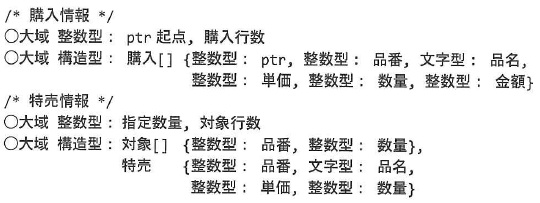 問08 必須問題次のプログラムの説明及びプログラムを読んで,設問1,2に答えよ。 ある食料品店では,従来の特売方法に加えて,新たに選択型特売を始めることになった。 選択型特売とは,例えば3種類の商品中から合計3個(3商品を各1個,同一商品を3個など)を 選択して購入すれば値引きをするという特売方法である。 このプログラムは,レジ用プログラムの一部として,選択型特売の値引き処理をする。 プログラムの実行は,顧客がレジに持ち込んだ商品のバーコードを全て読み込んで, 購入する商品が確定した時点で行うものとする。 〔プログラムの説明〕 (1) 顧客がレジに持ち込んだ商品の情報(以下,購入情報という)及び1種類の選択型特売に ついての商品の情報(以下,特売情報という)は,次のように宣言された大域の 変数及び配列で他のレジ用プログラムと受け渡す。配列の添字は,1から始まる。 ![]() (2) 購入情報の内容は,次のとおりである。図1は,購入情報のデータ例である。
