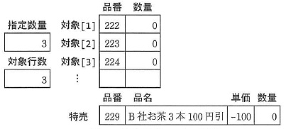 A 対象[] は,品番,数量 のメンバから成る1レコードを1要素とする構造型の 配列である。品番 には,特売対象の商品の品番が格納されている。対象[] には, 要素が品番の昇順に添字1から格納されている。 B 対象行数 は,対象[] 中に格納されたレコード件数を示す。 C 指定数量 は,特売対象の商品を合計何個購入する必要があるかを示す。 D 対象[] 中及び 特売 中の 数量 には, 初期値0が格納されている。 E 図2には,特売情報のデータ例として,次の特売例を示してある。