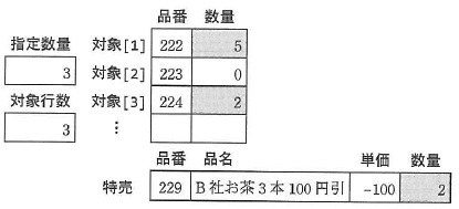 図2 特売情報のデータ例 (4) 処理は,検索部,計算部,更新部から成り,この順に実行する。 A 計算部では,対象[] 中の各 数量 の値の合計を 指定数量 で割った商を, 特売 中の 数量 に格納する。 B 更新部では,特売 中の 数量 の値が1以上であれば,購入[] に 特売 の レコードを追加し,購入情報を更新する。 (5) メンバの参照は,例えば,購入[3] の 品番 を参照するときは,購入[3] .品番 と 記述する。 (6) 図1及び図2のデータ例を用いてプログラムを実行した結果は,図3及び図4のとおりである。 図3及び図4中の網掛け部分は,実行によって内容が変更された箇所であることを示す。