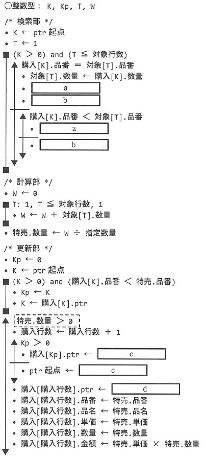 設問1 プログラム中の a,b に関する解答群 ウ K ← 購入[K].ptr エ T ← 1 オ T ← T + 1 c,d に関する解答群 ウ 購入[K] .ptr エ 購入[Kp].ptr オ 購入[購入行数] .ptr 力 購入行数