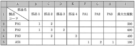 問13 表計算次の表計算,ワークシート及びマクロの説明を読んで,設問1〜3に答えよ。 〔表計算の説明〕 A社は,製品コード PA1,PA2,PA3,AS1 の4種類の製品の生産計画を立案するために, 三つのワークシート “部品一覧”,“受注一覧”,“生産管理”を作成することにした。 各製品の生産計画の概要は次のとおりである。 (1) 各製品の生産に必要な部品とその個数は,図1のワークシート“部品一覧”の とおりであり,製品 AS1 の生産には,製品 PA1,PA2,PA3 を部品として用いる。 各部品は,生産着手時に投入され,着手した製品は全てその日のうちに完成する。 (2) PA1,PA2,PA3 は ,1日の生産基準数をあらかじめ設定しておき, これに翌日生産分の AS1 の部品として必要な個数を加えた値を生産数とする。 (3) 生産基準数は,1週間ごとに決定する。 (4) 生産基準数は,これを決定する週と翌週の2週間分の納品予定に基づき, 納品予定日の前日までに納品数を用意するとともに,一定の余裕をもった在庫数を 確保するように決定する。 (5) PA1,PA2,PA3 は,10 個単位で生産する。各製品の1日の生産数の上限は, 図1のワークシート“部品一覧”の最大生産数のとおりである。 (6) AS1 は,20 個単位で生産する。AS1 は,受注生産品であり,納品予定日の前日に, 翌日の納品に必要な最低限の個数を 20 個単位で生産する。ただし,1日の 最大生産数を超える受注は受け付けない。 (7) ワークシートの日付は,yyyy-mm-dd の形式で表示する。表計算ソフトの 内部では,1970 年1月1日を1とした経過日数を整数で保持している。 〔ワークシート:部品一覧〕 ワークシート“部品一覧”には,各製品を生産するために必要な部品の個数と, 1日に生産可能な最大生産数を,図1のように格納してある。